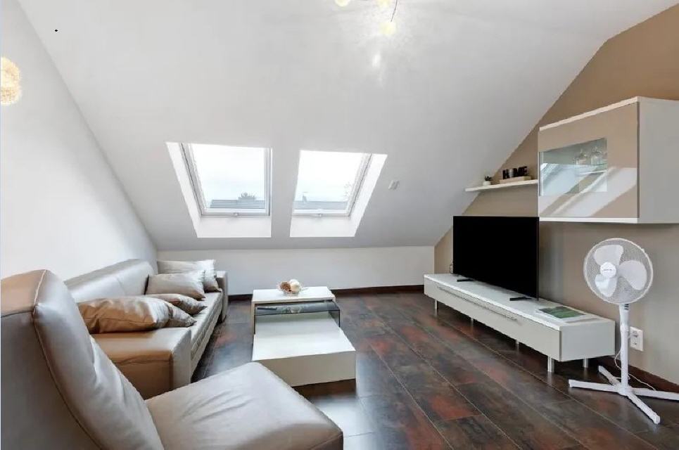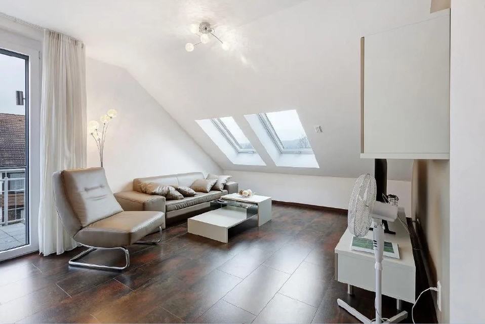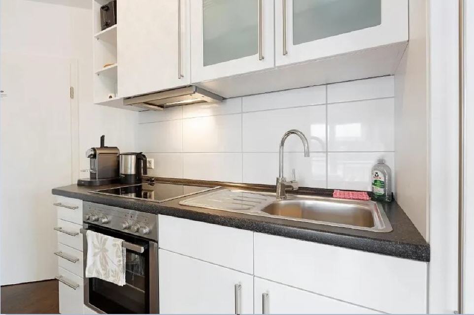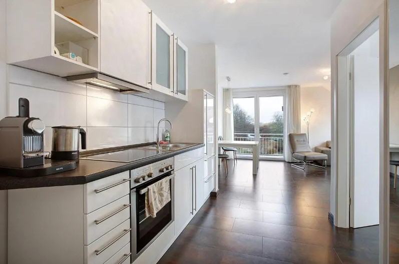 Wohnzimmer mit integrierter Küchenzeile. Das großzügige Wohnzimmer bietet Ihnen eine voll ausgestattete Küchenzeile mit Backofen, Kühlschrank, Induktionsherd und Kapsel-Kaffeemaschine. Ein gemütliches Sofa und ein Smart TV laden zum Entspannen ein. Durch die großen Fenster genießen Sie einen Blick auf die Weinberge und die sanfte Hügellandschaft des Markgräflerlandes.