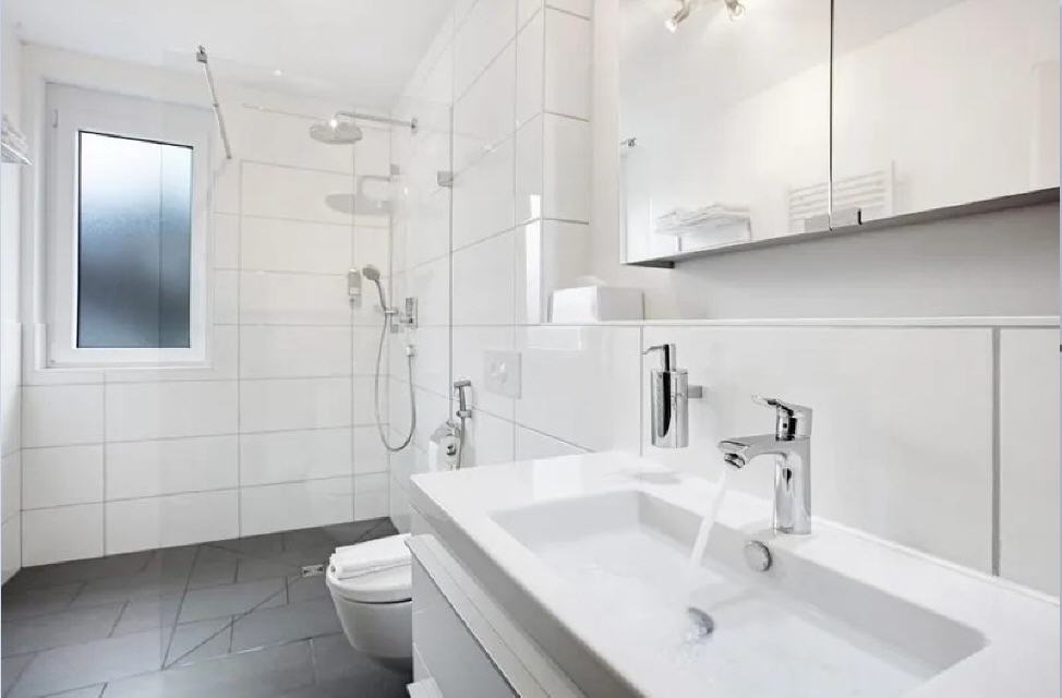 Modernes Badezimmer mit Dusche. Das Badezimmer ist modern gestaltet mit einer großzügigen Dusche, hochwertigen Armaturen und frischen Handtüchern. Alles für einen komfortablen Aufenthalt.