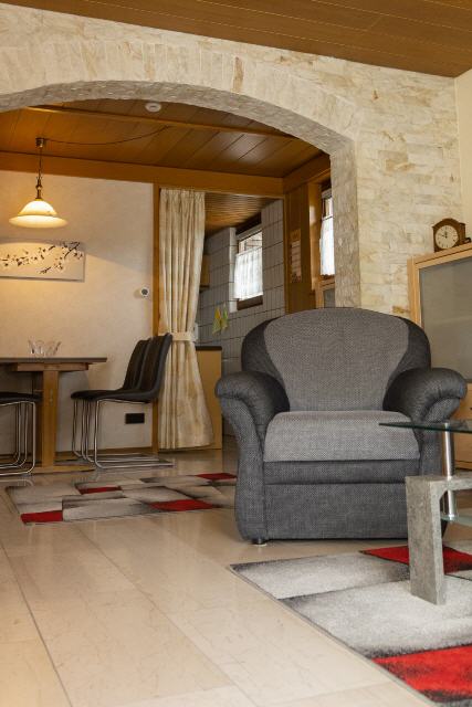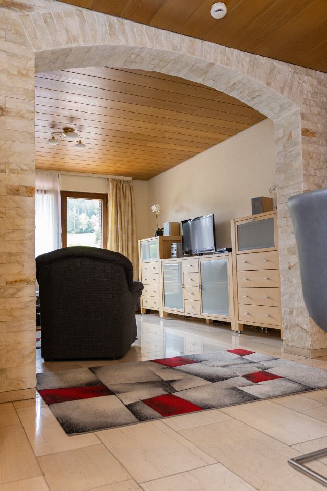 Lassen Sie sich von einem schicken Bogen aus edlen Marmorriemchen vom Esszimmer ins Wohnzimmer führen. Hier, im Herzen Ihrer Ferienwohnung, erwartet Sie eine gemütliche Sofa-Ecke, die perfekt positioniert ist, um Ihnen sowohl Unterhaltung am Fernseher als auch den malerischen Blick in das beruhigende Grün des Schwarzwaldes zu ermöglichen.