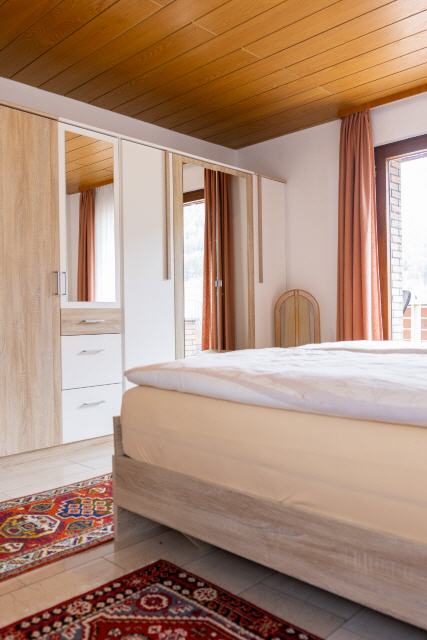 Im geräumigen Schlafzimmer erwartet Sie ein kuscheliges Doppelbett, ein großzügiger Kleiderschrank, eine Kommode und Nachttische, die Ihnen viel Platz und Komfort bieten. Auch von hier aus haben Sie direkten Zugang zur großen Balkonanlage, die den Zauber des Außenbereichs noch näher bringt.
