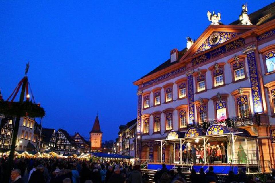 Gengenbacher Adventskalender. Schon seit 20 Jahren erweist sich das Gengenbacher Rathaus in der Adventszeit als magischer Anziehungspunkt: Es verwandelt sich mit seinen 24 Fenstern in das weltgrößte Adventskalenderhaus. Kommen, schauen, staunen: 100.000 Besucher waren es allein in der zurückliegenden Adventszeit, die sich dem allabendlichen Ritual in den Bann ziehen ließen. Um 18 Uhr beginnt das Fensteröffnungs-Ritual. Würziger Duft schwebt durch die kalte Luft, angeregtes Stimmengewirr, fröhliches Lachen… Plötzlich wird es still. Das Rathaus liegt im Dunkeln. Ein Licht, viele Lichter, magisches Blau, Rot und Silber streifen über die prächtige 200 Jahre alte Rathausfassade, steinerne Figuren erwachen zum Leben.