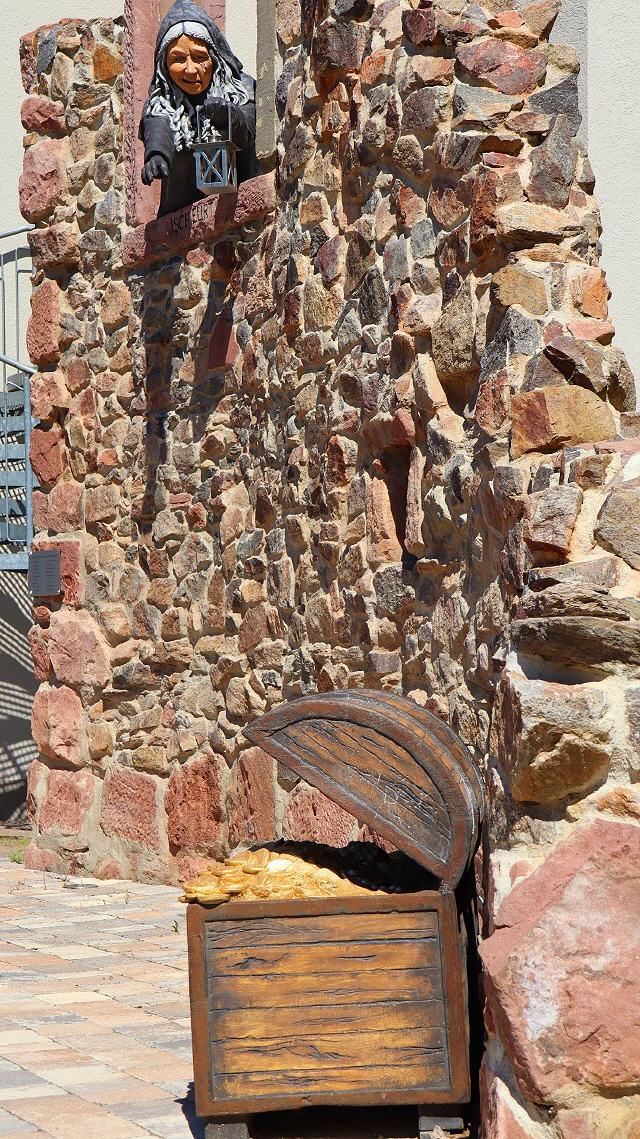 Unweit der Heidburg befindet sich der Schlosshof. An einem Sonntagmorgen war die Bäuerin allein zu Hause, während die anderen die Kirche besuchten. Plötzlich öffnete sich die Küchentür und ein stattlicher Ritter trat herein. Er versprach ihr einen großen Schatz, sie müsse aber selbst mitgehen und ihn holen. Soviel sie auf einmal tragen könne, dürfe sie mitnehmen, aber ja nicht mehr. So folgte die Bäuerin dem Ritter in einen unterirdischen Gang. Vor drei großen Geldtruhen mit Gold und Silber machten sie halt. Aus Bequemlichkeit aber nahm sie von jedem nur wenig heraus in der Hoffnung, den Rest nach und nach noch holen zu können. Als sie aber nach einiger Zeit alles ausgegeben hatte und zur Heidburg zurückkehrte, um mehr von dem Schatz zu holen, war der Eingang zur schatzkammer plötzlich verschwunden. Sie bereute es nun bitter, der Weisung des Ritters nicht gefolgt zu sein. So war sie wieder arm und es blieb ihr nichts außer einem edlen Gewand. "De Schatz - isch furt."